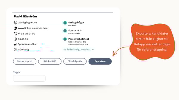 Integrationen mellan Refapp och Higher är utformad för att skapa ett sömlöst arbetsflöde för användarna och en automatiserad referenstagning. Oavsett om du genomför referenstagningen digitalt eller behöver schemalägga ett telefonsamtal med referenser, hjälper vi dig att spara tid och arbeta organiserat.